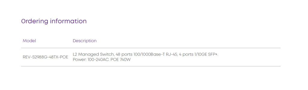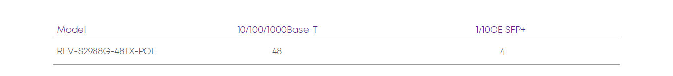 The S2988G series is a new generation of L2 access layer REV switches with 1/10GE SFP+ Uplink-ports. Port capacity and functionality of S2988G series switches provides the ability to build Gigabit access level in enterprise networks and internet service providers networks.